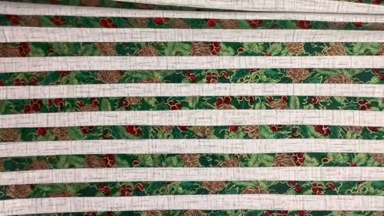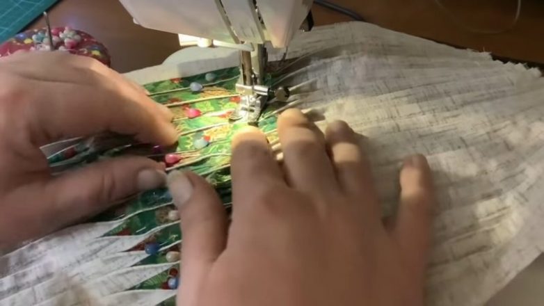 Для декора вам потребуются полоски 46*2 см белого и зелёного цвета. Зелёный может быть с каким-то другим цветом и рисунком. На машинке сшейте полосы между собой, чередуя цвета.
