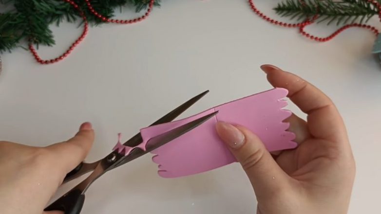 Вырежьте кусочек фоамирана 10*4,5 см. Сделайте края волнистыми.