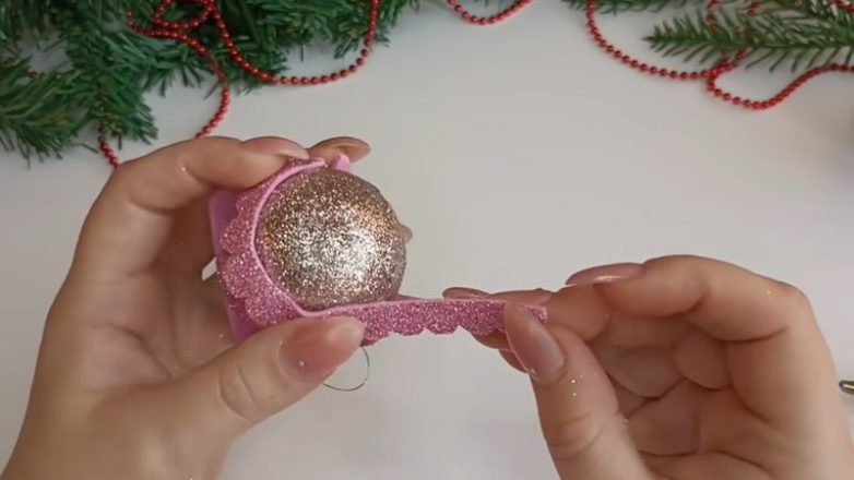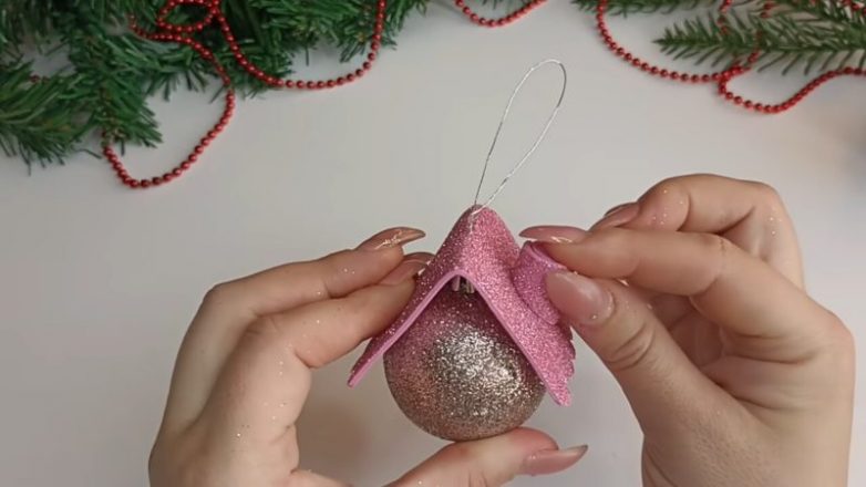 Проденьте с помощью иголки в основание ёлочного шарика, закрепите по бокам горячим клеем.