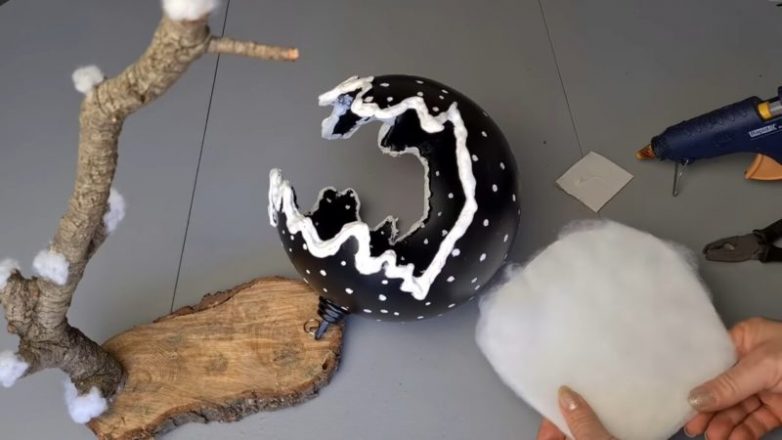Чтобы шар держался, сделаем для него подставку из деревянного спила и толстой ветки. Склеим их вместе хорошим и прочным клеем для дерева. На ветку можно приклеить кусочки синтепона — пушистого «снега».