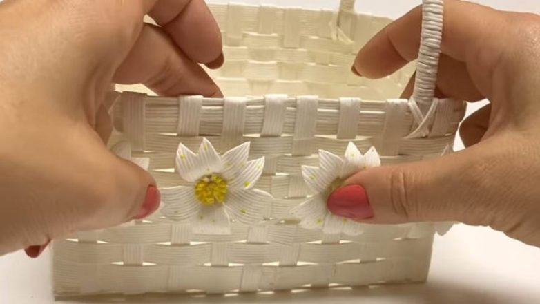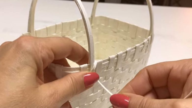 Также вырезаем полоски для ручек, продеваем их через плетение, фиксируем клеем. Дополнительно переплетаем и оборачиваем ручки тонкими полосками.