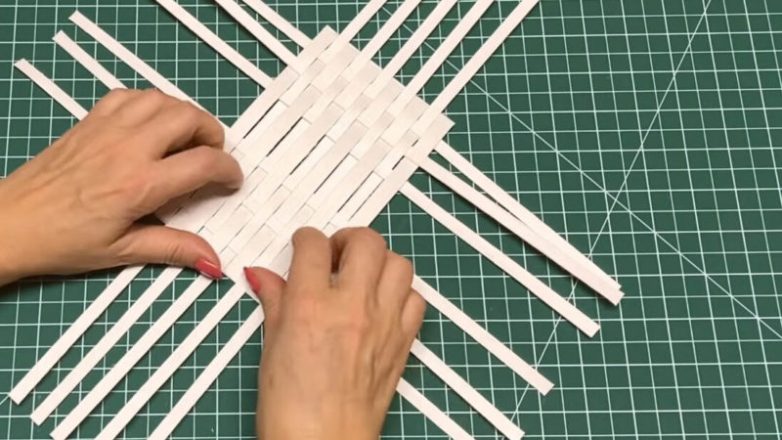 Приступаем к плетению самой корзинки. Вырезаем 5 полос 42 см, и 6 по 16 см. Высота полос — примерно 1 см. Раскладываем полосы через одну. По бокам склеиваем по одной полоске 10 см длиной, которая будет скреплять конструкцию.