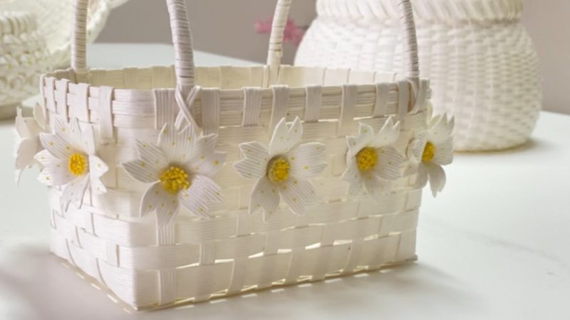 Для украшения корзинки используются самодельные цветы. Если вы не хотите украшать корзинку, то этот шаг можно пропустить. Итак, длинную полосу из ротанга вырезать, сделать надрезы не до конца, свернуть в улитку, склеить концы и покрасить акриловой краской.
