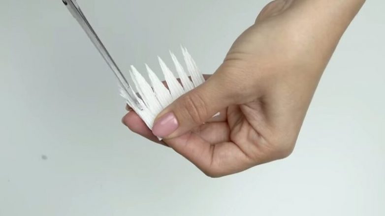 Из белой гофрированной бумаги вырежьте прямоугольник 8*5 см. Сложите пополам и сделайте зубчики.