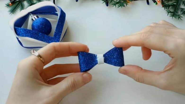 Сверху, между полосками, вставьте маленький ёлочный шарик в цвет фоамирана. Склейте сверху.
