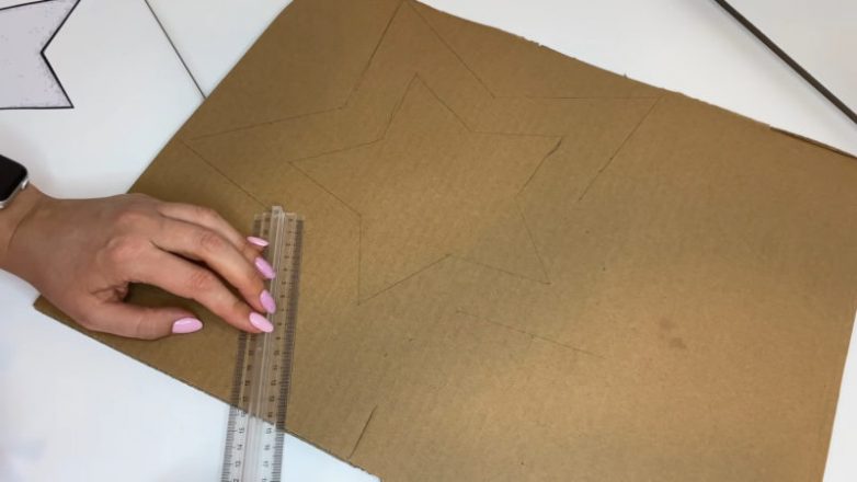 Вырежьте из плотного картона звезду желаемого размера. Для удобства работы используйте трафарет. Прибавьте к линиям по 4 см с каждой стороны: это будут внешние границы звезды.