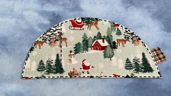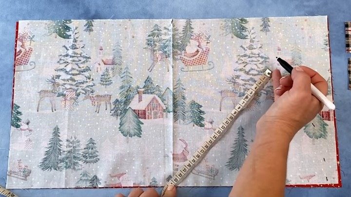 Сложите большие прямоугольники лицом друг к другу. На длинной стороне отметьте центр, а на сантиметровой ленте отложите 23 см. Прижмите сантиметровую ленту к отмеченной на ткани точке и, постепенно проворачивая её по кругу ставьте метки. После этого соедините метки единой чертой — получится полукруг. Сколите слои ткани вместе и вырежьте деталь по получившейся линии.