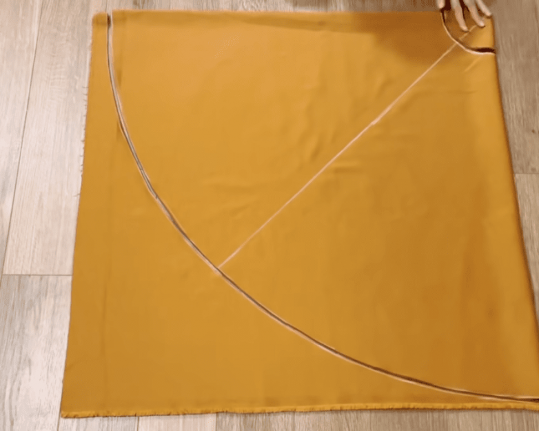 Проводим вдоль диагонали сплошную линию до низа изделия. С того же угла откладываем в обе стороны по 10 см и снова формируем окружность, а затем вырезаем середину.