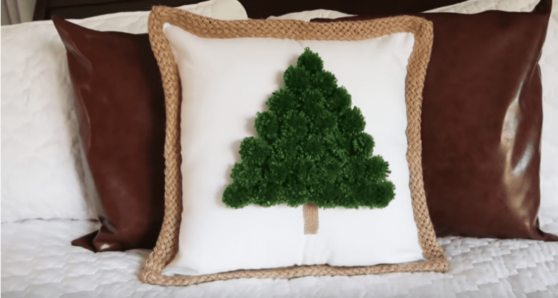 Подготовив таким образом необходимое количество бубончиков, переходим к составлению рисунка. На выбранную основу, в нашем случае это декоративная подушка, приклеиваем или пришиваем получившихся пушистиков в виде пирамиды, выстраивая таким образом елочку.