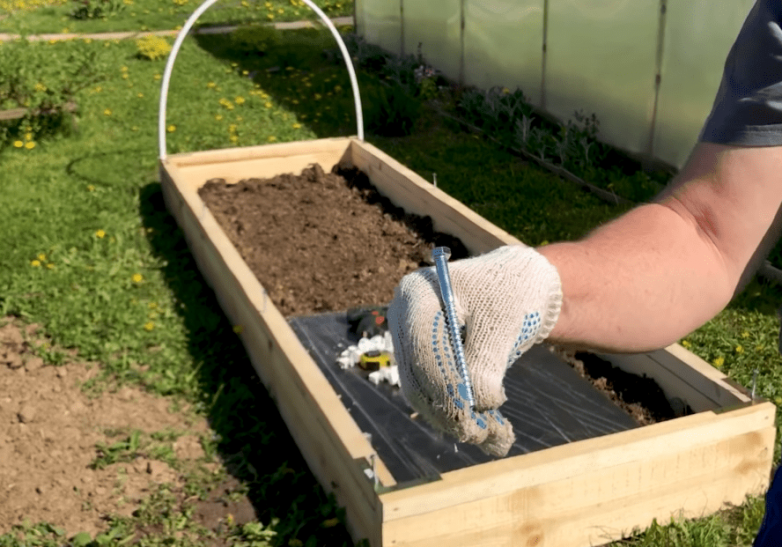 Короб собран из поставленной на ребро доски 50х200, закрепленной по бокам длинными шурупами. Если парник со временем не планируется переносить, то для надежности по периметру можно вбить с наружной стороны небольшие куски арматуры.