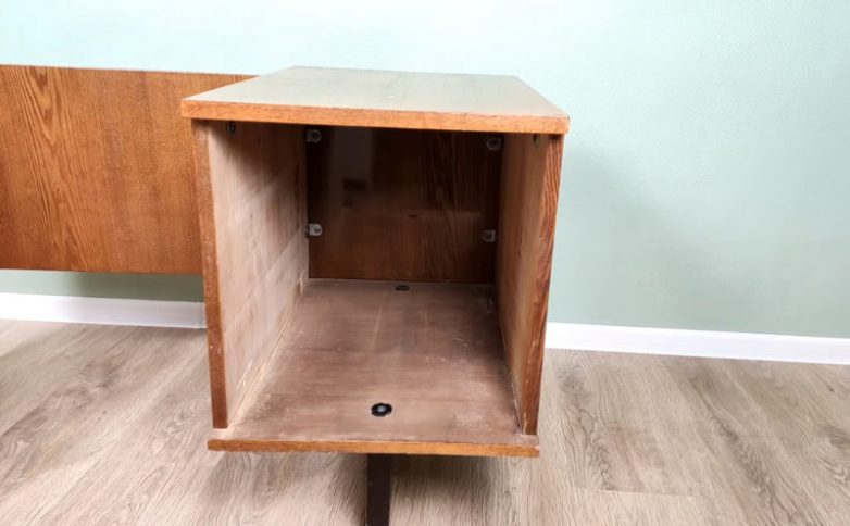Для удобства работы со старым столом частично разберите его, выньте выдвижные ящики, снимите направляющие. Зашлифуйте поверхности, которые не были покрыты лаком или полиэфиром.