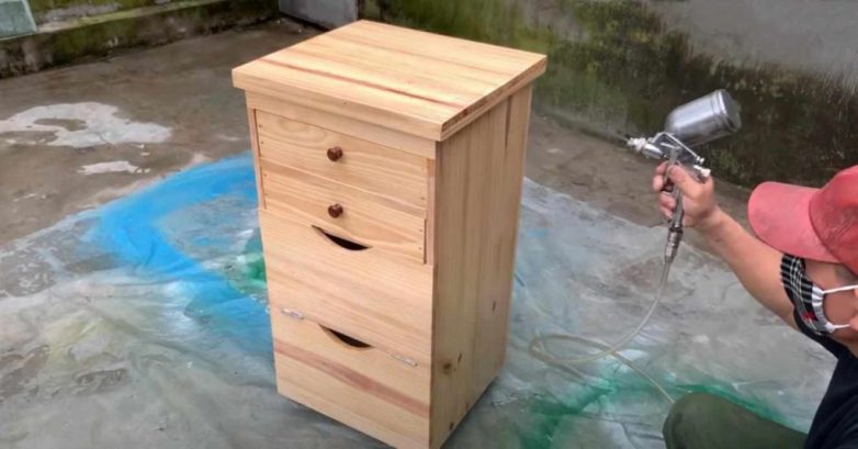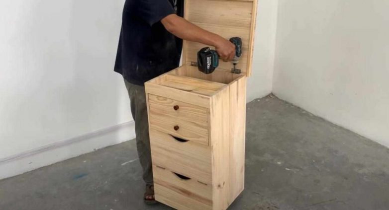 Сначала изготавливаем две части столика вместе с полками, и отдельно надо будет сделать выдвижные ящики. Соединяем обе части с помощью петель.