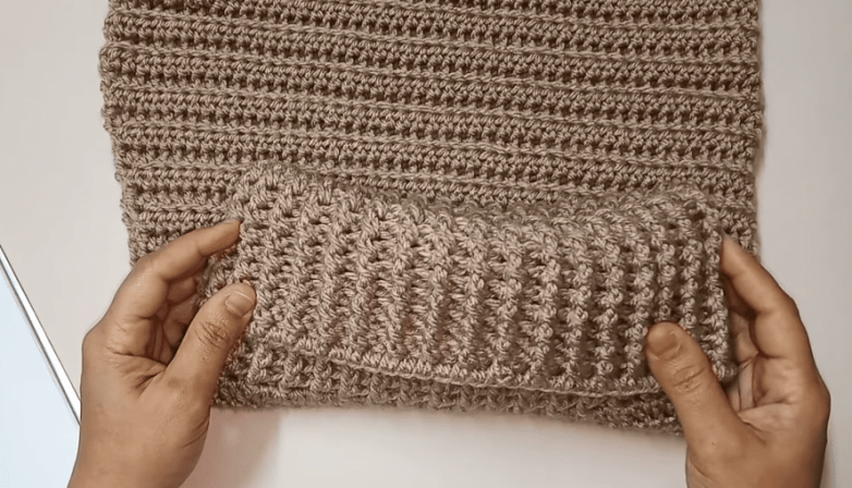 Начиная со 2-го ряда ПССН провязываются только за заднюю стенку петли предыдущего ряда. Именно за счет этого образуются красивые рельефные полосы. В конце первых 16 рядов делается 1 прибавка. Для этого в основание последней петли провязывается не 1, а 2 ПССН. За счет прибавок в дальнейшем будет сформирован отворот на капюшоне.