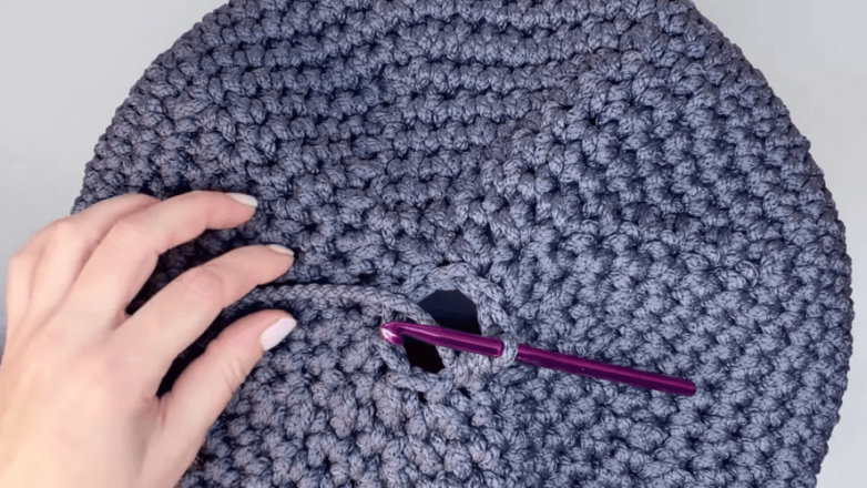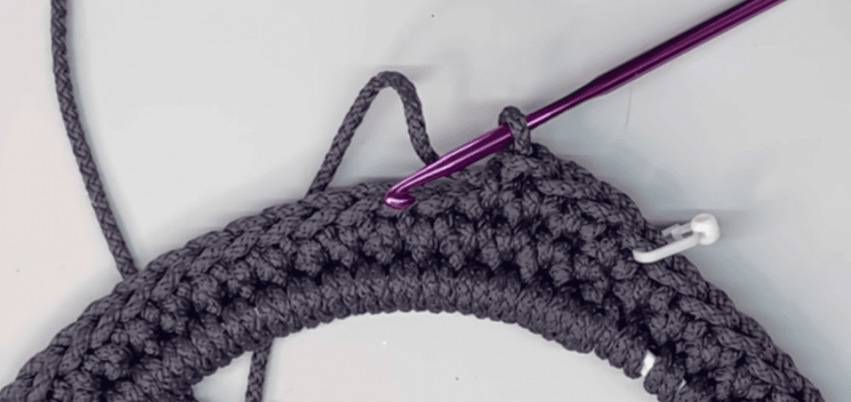 При вязании корпуса используется всего 1 прием — столбики без накида (СБН). Суть его заключается в том, чтобы протянуть рабочую нить через основание петли предыдущего ряда, а затем закрыть обе находящиеся на крючке петли в один прием. Первый ряд несколько отличается, здесь рабочую нитью нужно захватывать так, чтобы обвить обруч. Для этого заводим крючок снизу, подхватываем рабочую нить и выводим вперед. Образовавшуюся полупетлю закрываем вместе с находящейся на крючке петлей в один прием.