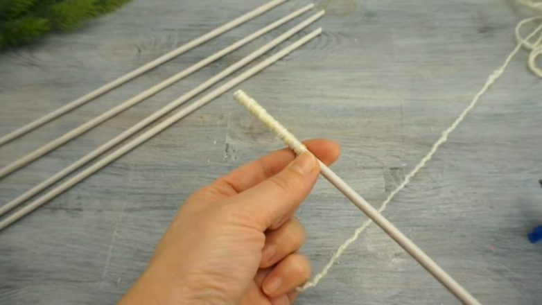 Из бумаги и спицы сделать трубочки длиной примерно 35 см. На каждую из них намотать пряжу, края приклеить.