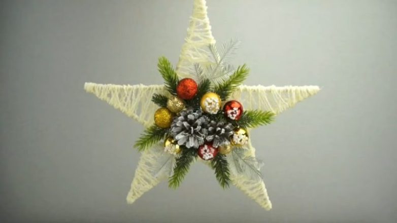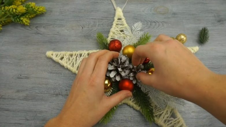 Теперь приклеить в центр звёздочки любой новогодний декор по вашему желанию: ёлочные шарики, шишки, еловые веточки.