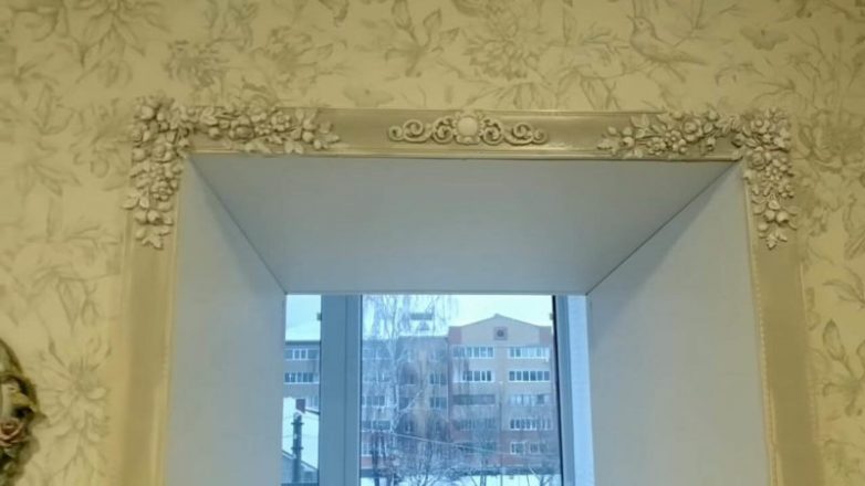 Как видите, в таком виде оконная рама смотрится изысканно, дорого, по-старинному. Вы можете выбрать трафареты, которые будут более простыми, например, без мелких деталей.