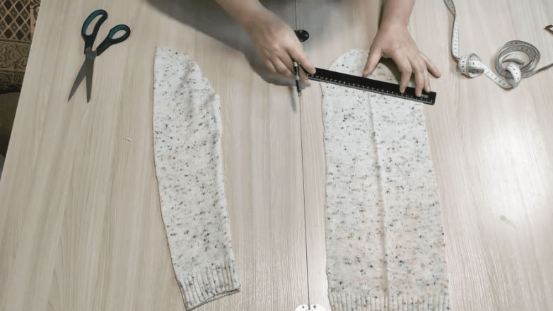 Прежде чем разрезать свитер, его нужно отутюжить. Так гораздо проще будет делать замеры и разрезать трикотажное полотно. Для начала отрезаем от свитера рукава, а затем избавляемся от резинки снизу.