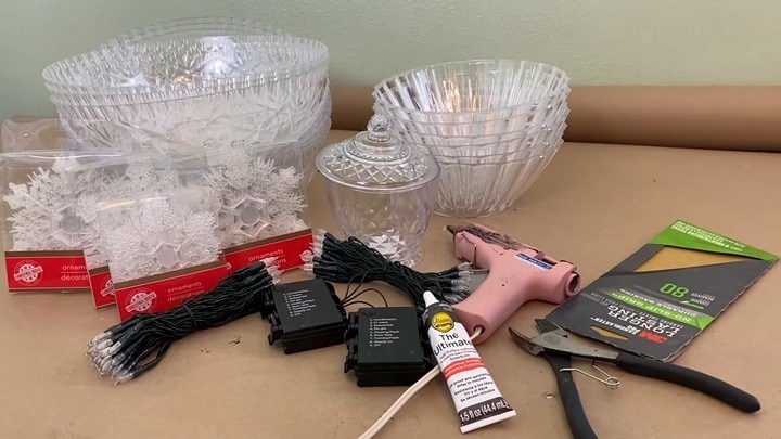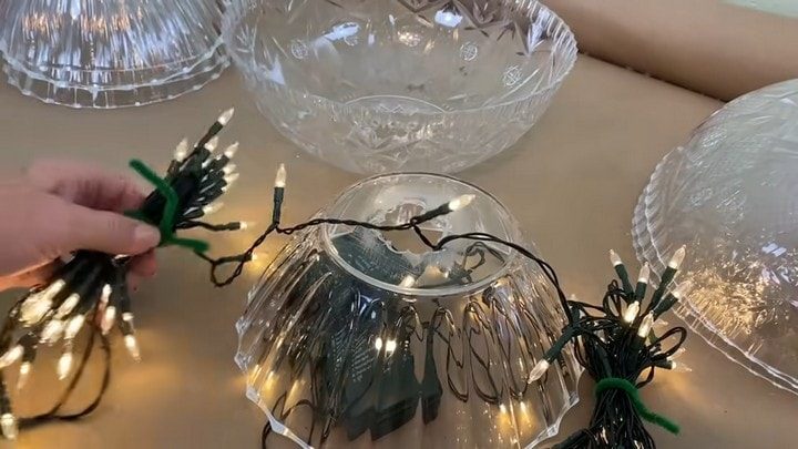 Трудно поверить, но эта красота создаётся из самых дешёвых товаров, которые можно найти в ближайшем магазине: прозрачные пластиковые миски «под хрусталь» и пара гирлянд, работающих от батареек.
