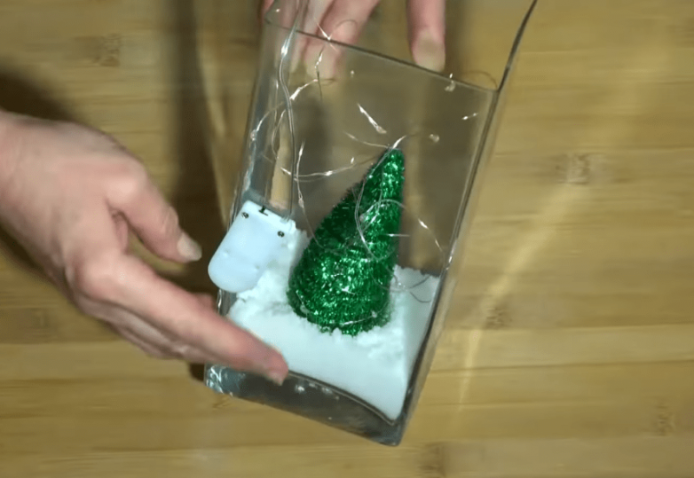 На дно высокого прозрачного стакана насыпаем соль, которая станет удачной имитацией снега. Обвиваем елочку светодиодной гирляндой, двигаясь снизу вверх. Излишки нити оставляем в стакане, а выключатель выводим наружу.