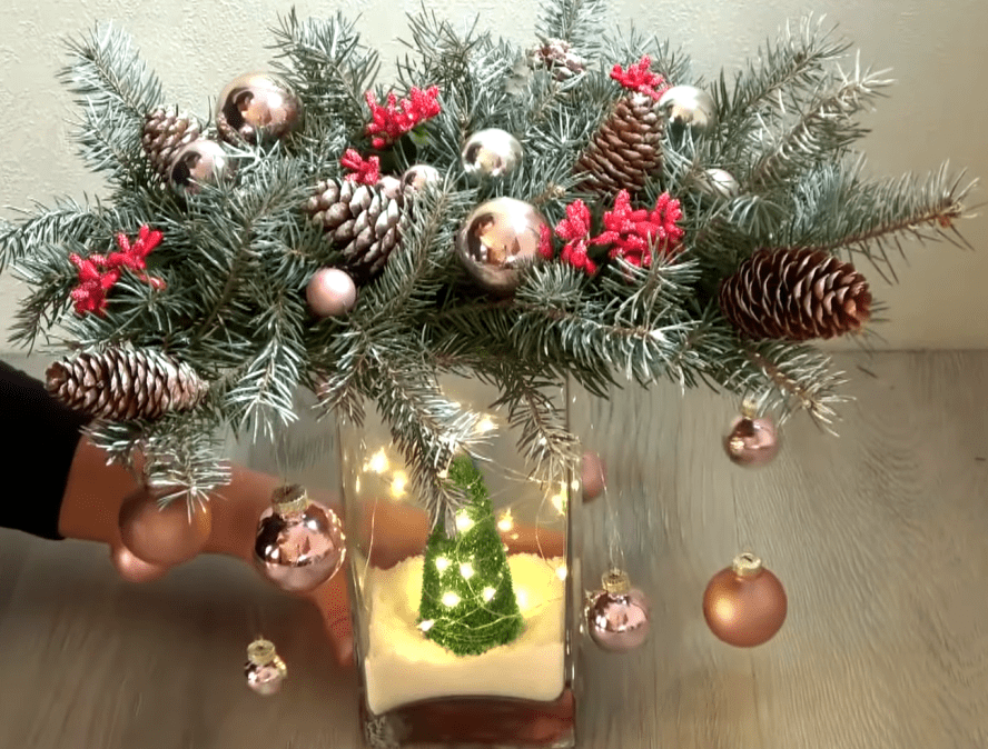Шикарную новогоднюю композицию легко сделать своими руками из подручного материала. Выглядеть она будет стильно и оригинально, отлично подойдет как для украшения дома, так и для офиса. Затраты при этом ничтожно малы, а атмосфера праздника гарантирована.