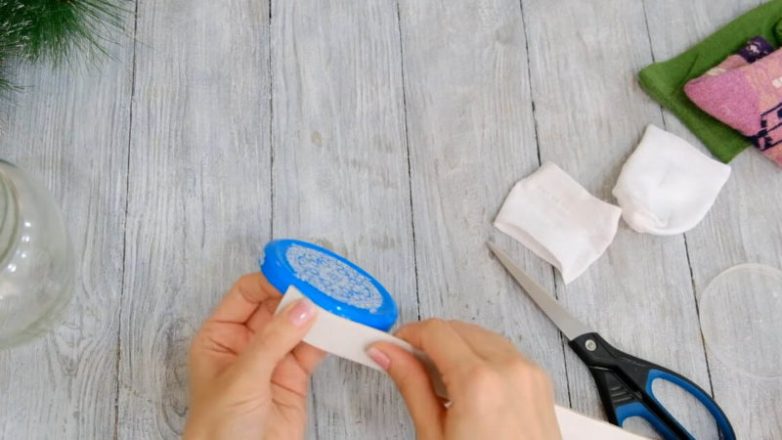 У банки удалите все этикетки, хорошо вымойте. Открутите крышку, к краю приклейте кусочек картона 2 см шириной, чтобы «нарастить» крышке края.