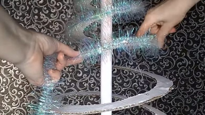 Верхнюю часть спирали зафиксируйте на трубе сверху. Через всю спираль насквозь проденьте леску, чтобы переход был более плавным. Леску зацепите сверху и снизу основания ёлки. Обмотайте и приклейте мишуру на спираль.