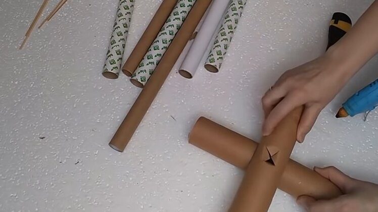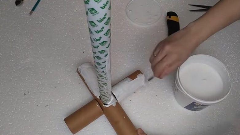 Соберите основание и ствол ёлочки-спирали из втулок от бумажных полотенец. Можно также использовать трубы ПВХ.