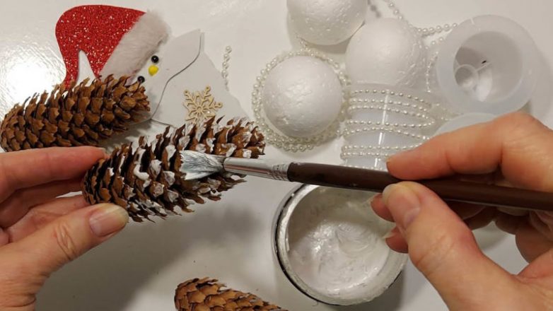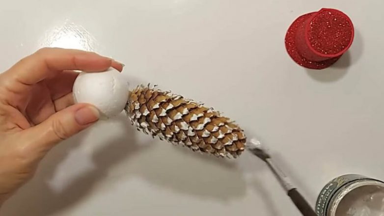 На шишку нанесите немного белой акриловой краски. Сверху приклейте шар из пенопласта.