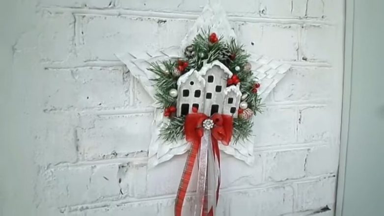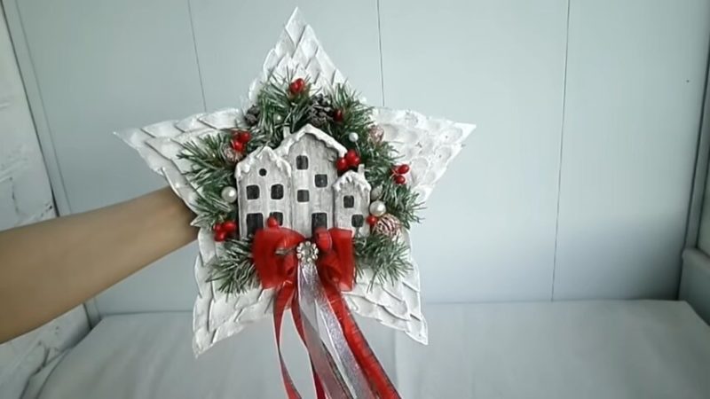 Можно также украсить лентами и бантом. Очень оригинальная звезда к Новому году!