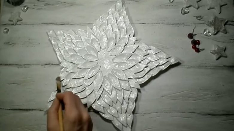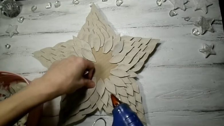 Приклеивайте их, начиная от кончиков звезды, плавно продвигаясь к центру.
