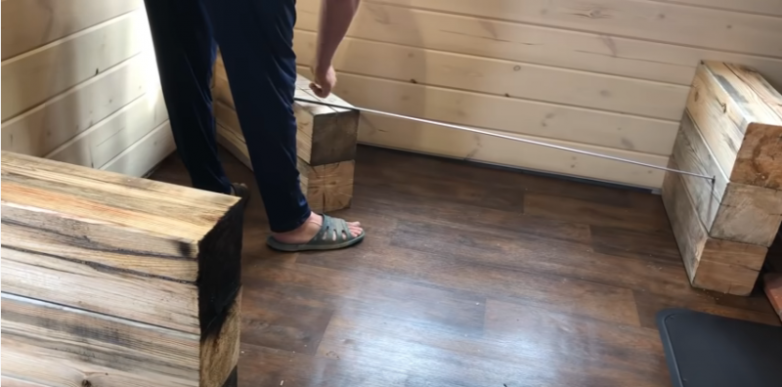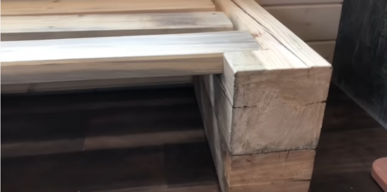 Подлокотники, а также центральная опора дивана будут изготовлены из бруса. Поэтому первым делом отмеряем, отрезаем и выставляем подготовленные из бруса заготовки, выстраивая таким образом каркас будущего дивана.