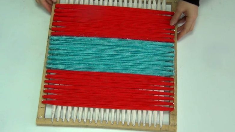 Возьмите пряжу, сделайте узел, закрепите на крайнем гвозде с любой стороны. Теперь протяните и обмотайте пряжей противоположный гвоздь 10 раз, вернитесь к первому, повторите со следующими. Таким образом, заполните первый вертикальный ряд.