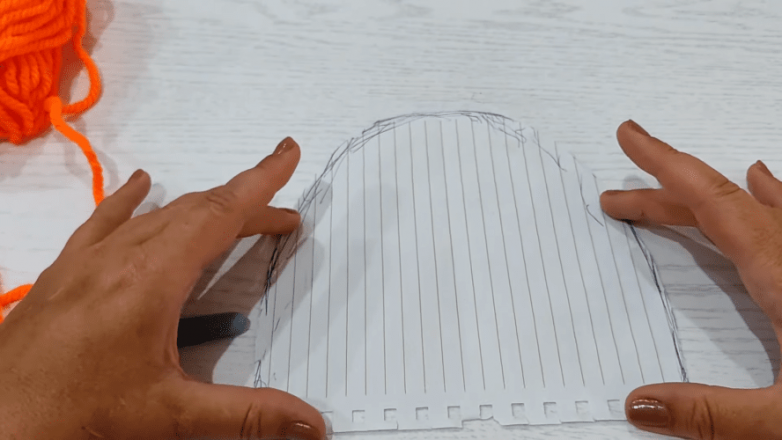 Вместо выкройки прикладываем кусок бумаги прямо к ноге или к тапку нужного размера и обводим контур. По ходу вязания к получившемуся шаблону добавляем припуск в 1 см вдоль всей дуги.