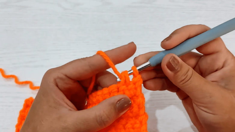 Там, где начинается закругление в начале каждого ряда сразу после подъемной петли делаем убавку. Для этого вытягиваем одну петлю и оставляем на крючке, а затем вытягиваем вторую, и только после этого довязываем СБН, протягивая рабочую нить через обе петли сразу.