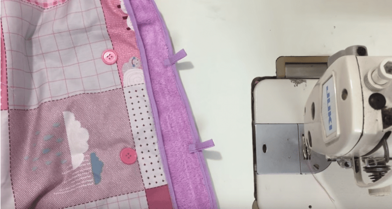 Из оставшейся косой бейки формируем петли на расстоянии примерно 10-15 см друг от друга. Напротив петель, отступив несколько см от края, размещаем пуговицы. Пришиваем всю фурнитуру и уютный плед-накидка готов!