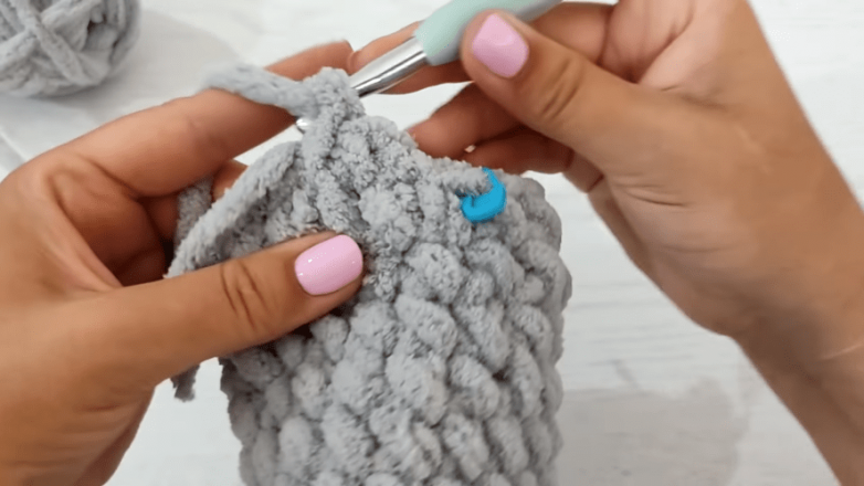 Дальше вяжем вкруговую 11 рядов, не забывая делать петлю подъема при переходе с одного ряда на другой. Количество рядов может быть и другим. Ориентиром является середина стопы. После того как цель достигнута, делаем соединительный ПС, замыкаем круг и обрываем нить. На данном этапе получаем мешочек.