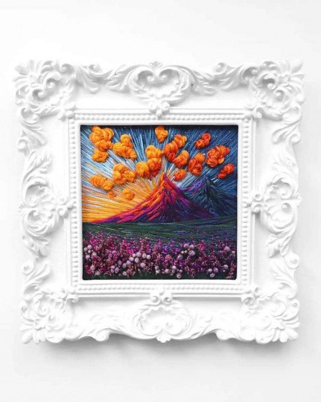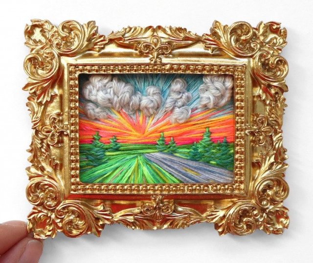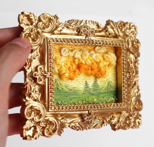 С помощью различной техники вышивки Торрес создаёт текстурированные пейзажи с облаками, деревьями, лугами, цветами, оживающими с каждым стежком. От горных пейзажей до цветущих лугов, каждая красочная вышитая вручную картина обрамлена в миниатюрную рамку, становясь похожей на то, что могло бы украшать кукольный домик.