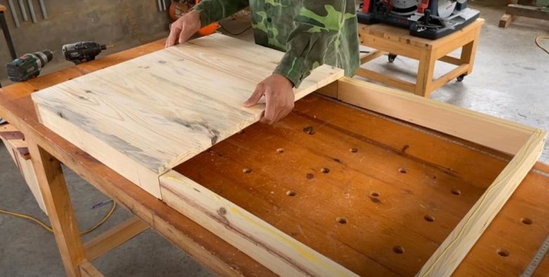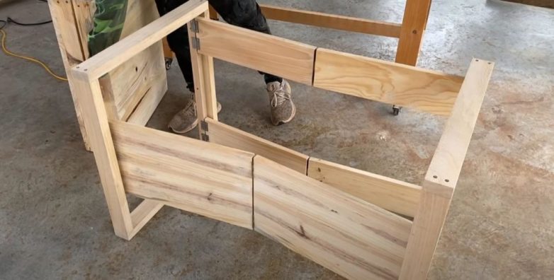 Отпиливаем четыре доски требуемой длины и соединяем их с помощью петель. Затем надо отпилить ещё два деревянных щита — соединяем их с помощью петель.