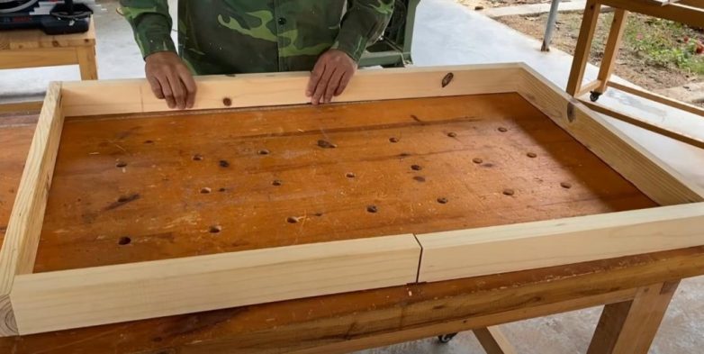 Первым делом из деревянных брусков необходимо будет собрать две квадратных или прямоугольных рамки — боковые части каркаса. Бруски скрепляем между собой на саморезы.
