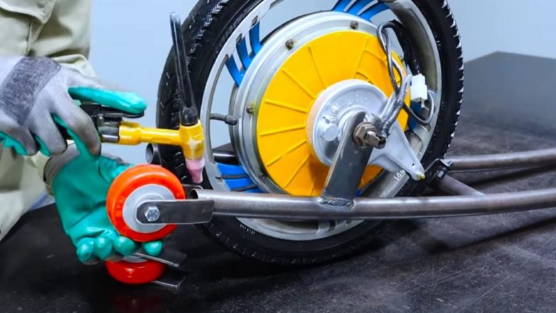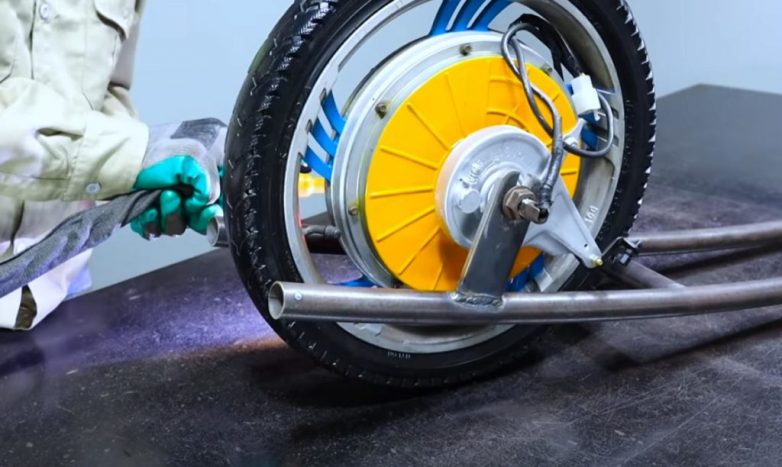 На следующем этапе из отрезков круглой трубы свариваем раму. Крепим к ней колесо с электромотором.