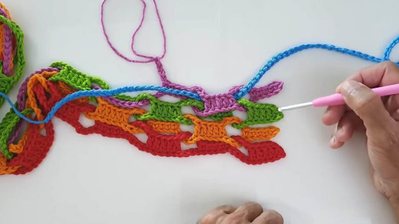 Наберите цепочку из 204 воздушных петель (ВП). Можно сделать меньше или больше, в зависимости от того, какого размера изделие вы хотите получить. Главное, чтобы кол-во ВП было кратно 9 + 6 (например, 198+6=204). Наберите цепочки из 204 ВП из разной пряжи. Теперь возьмите первую длинную цепочку из любой пряжи и начните вязание. Оно будет повторяться во всех последующих цепочках тоже. Сделайте на длинной цепочке сначала 5 столбиков без накида (СБН), затем — пропуск 4 петель + набор 4 ВП. После этого сделайте накид, вставьте крючок в пятую по счёту петлю и сделайте 5 столбиков с накидом (ССН). Затем снова пропуск 4 петель и в то же самое время — набор 4 воздушных петель, снова 5 СБН. Как вы видите, столбики с накидом и без накида будут чередоваться через один после каждого пропуска 4 петель. Такой простой узор повторяется до конца всей цепочки.