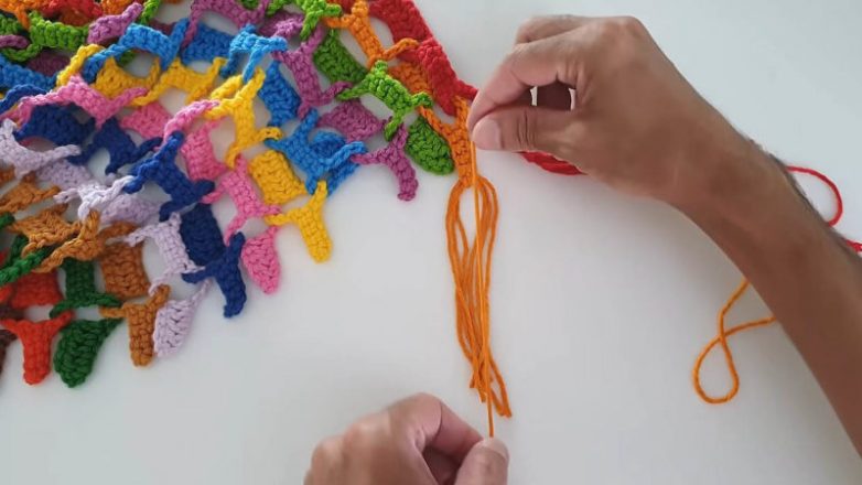 В конце, по бокам готового изделия вы можете привязать пряжу, сделав бахрому. Но это совсем не обязательно.