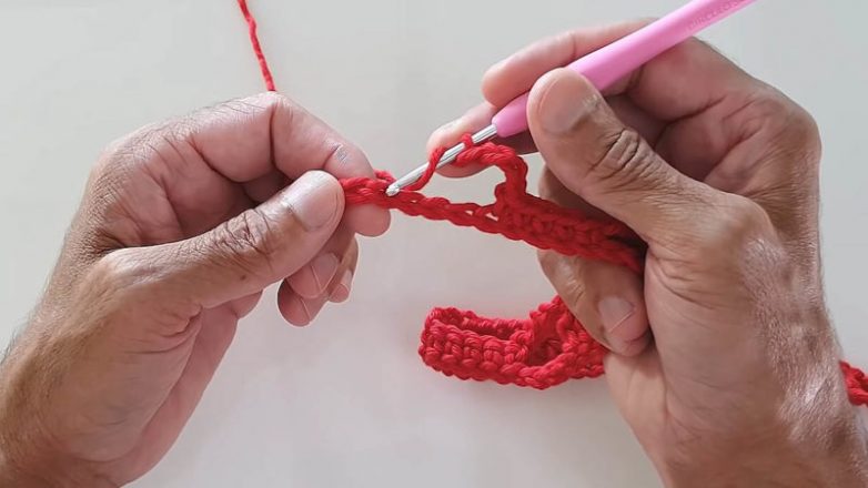 И провяжите всё то же самое, но на новой цепочке: начала 5 СБН, пропуск, потом — 5 ССН, пропуск… Всё это провязывается во второй цепочке, в то время как сама цепочка перекрещена с первой.