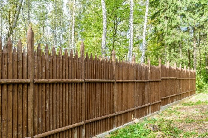 Цилиндрические деревянные брёвна одинакового диаметра, соединённые вместе, называются частоколом. Их можно заготовить самостоятельно.Самый простой способ сооружения забора – установка кольев непосредственно в землю. Очертите необходимую площадь, выкопайте траншею глубиной 1/3 бревна. Подготовьте колья, обработав подземную часть битумом. Расстояние между металлическими или деревянными опорами должно составлять 2,5 м. Но если хотите, чтобы частокол был крепким, залейте бетонный фундамент.