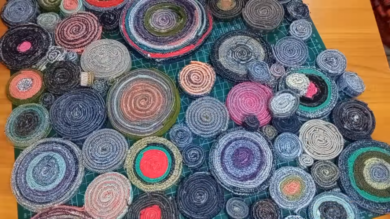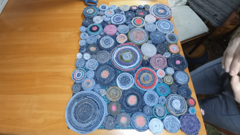 Собрав достаточное количество швов и предварительно превратив их в «улитки», выкладываем их так, чтобы получить коврик нужного размера. По мере стыковки используем бухточки разного диаметра. Затем последовательно, двигаясь от одного края к другому, вынимаем по одной заготовки и дополнительно проклеиваем с торцов в местах стыка.
