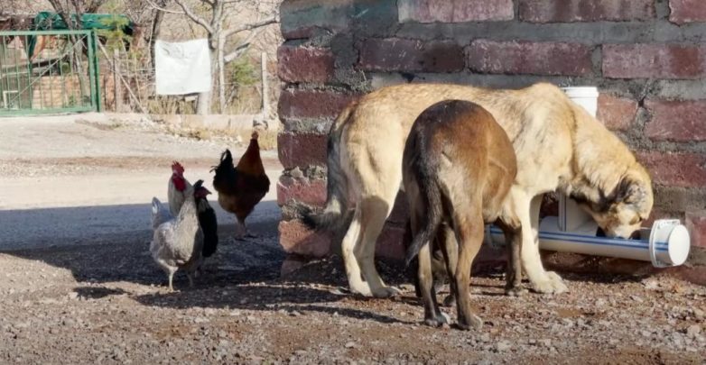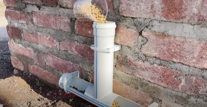Самодельную кормушку из пластиковых труб можно использовать как для домашней птицы, так и для котов или собак.