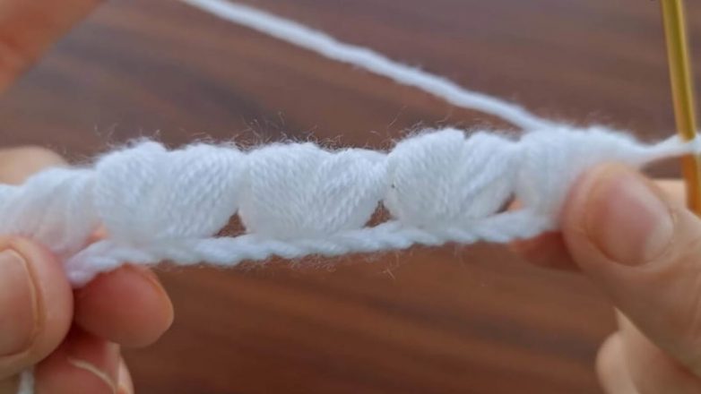 Провязав около 10 рядов, вы увидите рисунок более отчётливо. Он чем-то напоминает сердечки — ну, очень красивый!