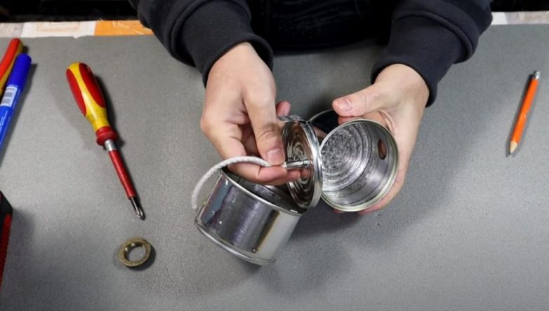 Одна из консервных банок будет использоваться в качестве «абажура», еще одна — в качестве топливной камеры, в которую будет заливаться растительное масло. А из третьей банки необходимо сделать крепление, с помощью которого «абажур» будет соединяться с топливной камерой.