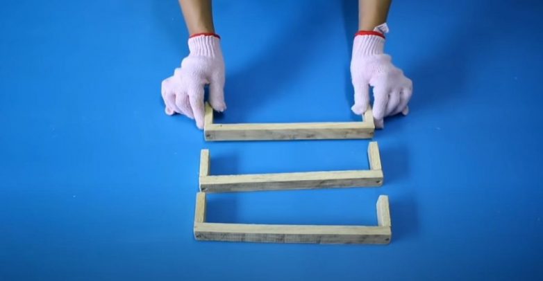 Стеллаж у нас будет трёхъярусным, поэтому подготавливаем три полки и крепим их между вертикальными боковыми стойками с помощью саморезов по дереву.